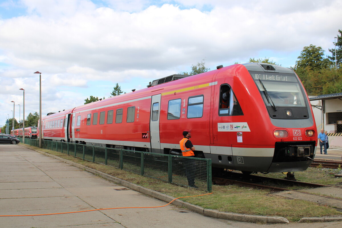 DB 612 022 mit passender Zugzielanzeige.